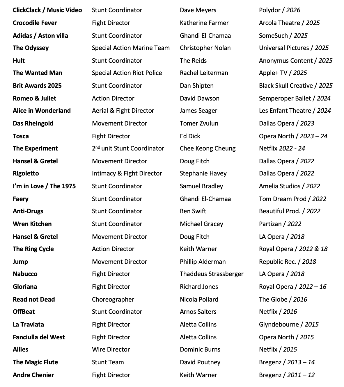 2026 looks even more exciting after working on Christopher Nolans epic The Odyssey with Mat Damon, Anne Hathaway, and Tom Holland as part of the Special Action Marine Team, going on to work on The Wanted Man for Apple TV with Hugh Laurie as Special Action Riot Police, as well as Stunt Coordinating on an Adidas advert for SomeSuch, Hult for Anonymous Content, Pokemon for Universal Studios, and brand new music video Click Clack for soul jazz singer Raye & Polydor Records, all the while studying full time on an Advanced English Literature Masters at Goldsmiths University.
